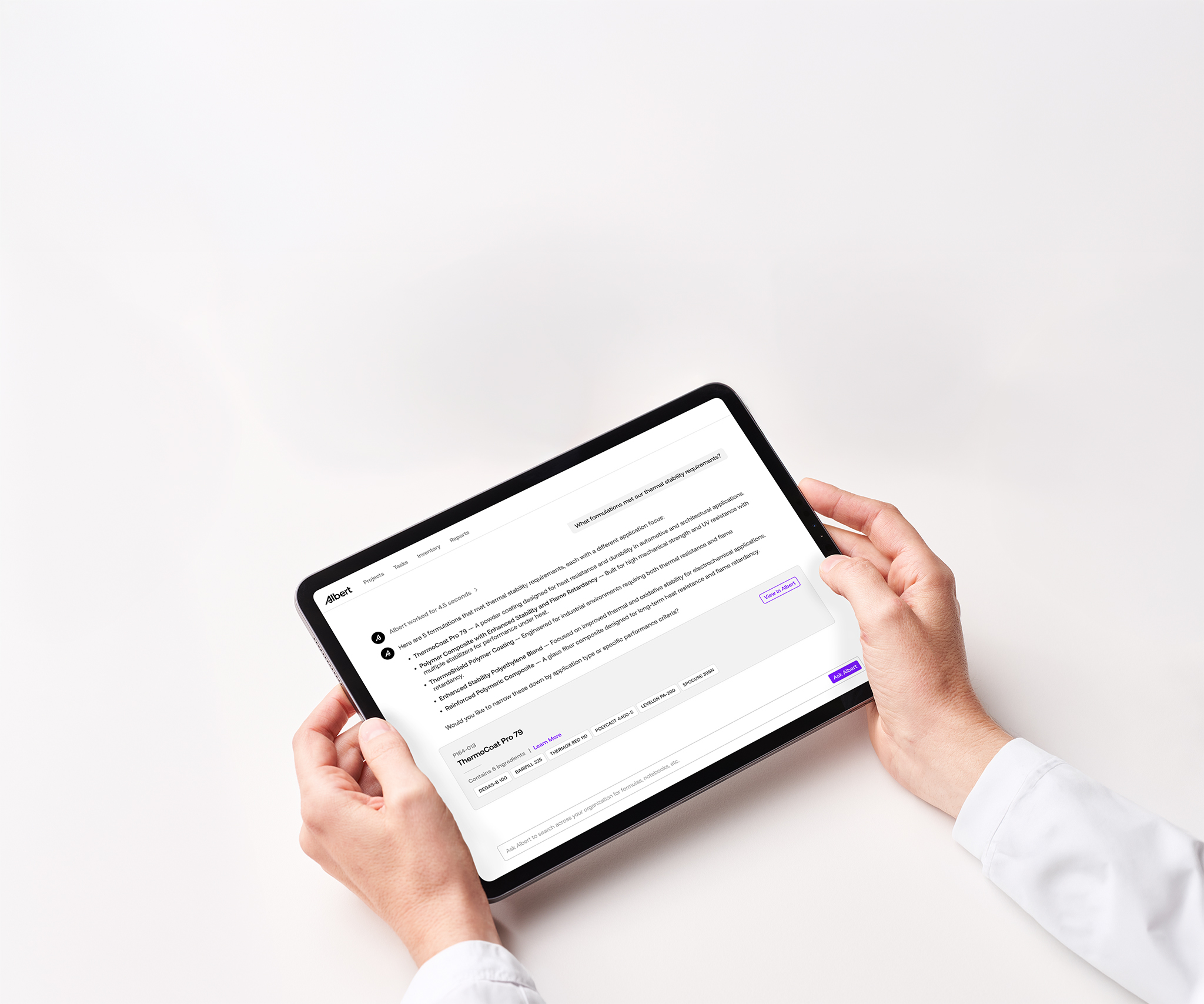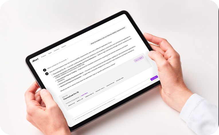 Ask Albert is your AI discovery engine that delivers immediate value, allowing scientists to instantly surface institutional R&D knowledge with conversational queries after uploading existing data. By lowering the barrier to entry, every organization can harness the power of AI from day one.