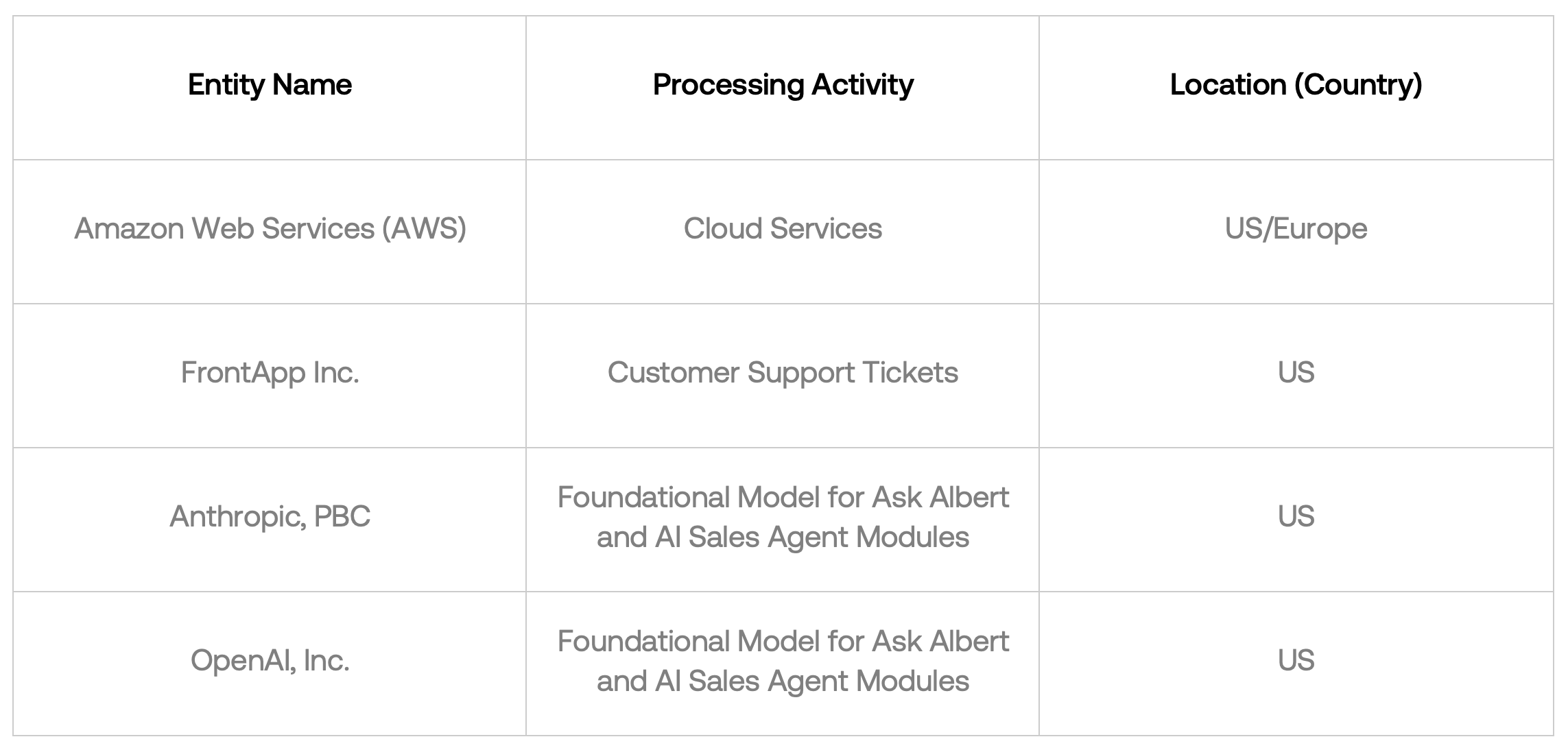 Albert Subprocessor List